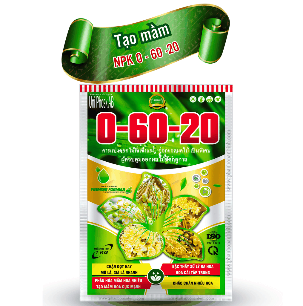 NPK 0-60-20 chuyên tạo mầm và phân hóa mầm hoa mạnh nhờ hàm lượng Lân cao 60% kết hợp Kali 20%, giúp cây nhanh chuyển sang giai đoạn ra hoa.