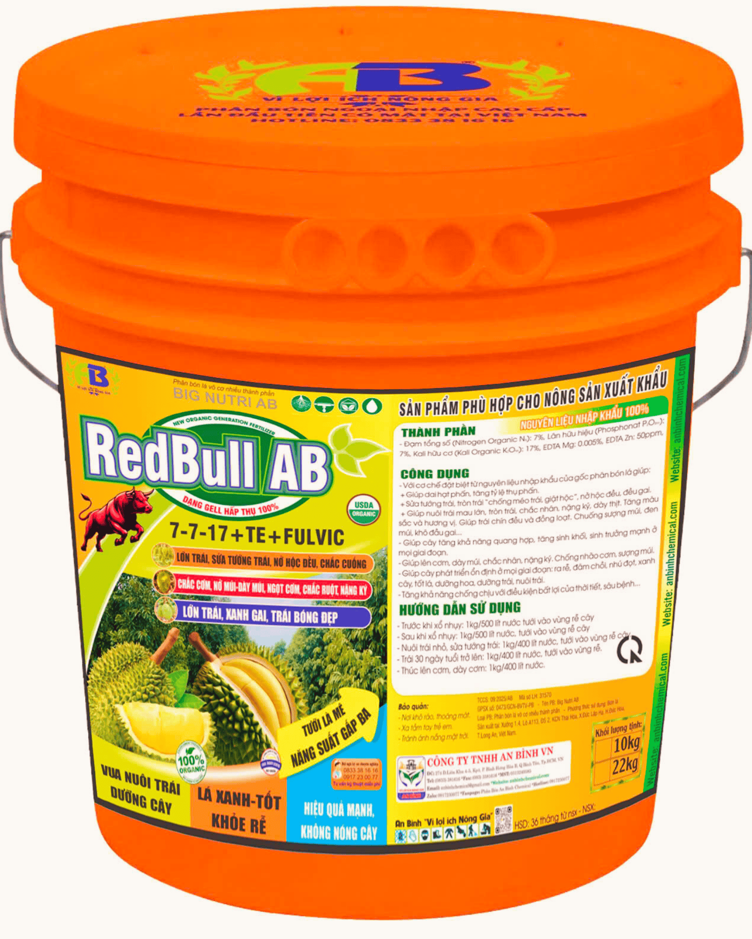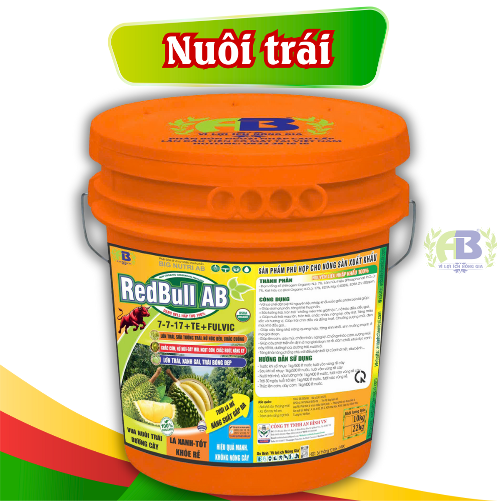 Phân bón lá RedBull AB 7-7-17 + TE + Fulvic là dòng sản phẩm phân bón hữu cơ thế hệ mới, được nghiên cứu và phát triển nhằm tối ưu hóa quá trình nuôi trái, dưỡng cây, giúp lá xanh – rễ khỏe, tăng năng suất vượt trội. Sản phẩm này không chỉ đáp ứng yêu cầu nông nghiệp bền vững mà còn phù hợp với tiêu chuẩn xuất khẩu, nâng tầm giá trị nông sản Việt.